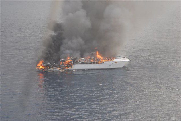 The 41-meter luxury yacht Seafaris, completely engulfed in flames off the coast of Cairns, Australia, October 2, 2013. Photo courtesy AMSA