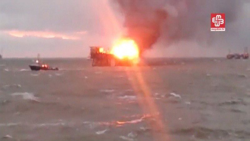 A still image from a video footage shows an oil platform on fire in the Caspian Sea, Azerbaijan, December 5, 2015. REUTERS/MEYDAN TV via Reuters