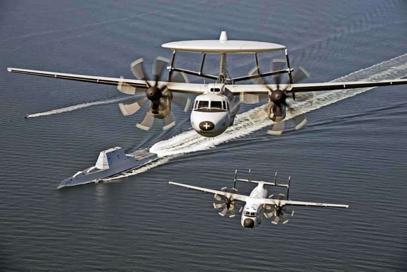 (Oct. 17, 2016) An E-2D Hawkeye and a C-2A Greyhound over USS Zumwalt (DDG 1000) as the ship travels to its new home port of San Diego, California. U.S. Navy photo by Erik Hildebrandt