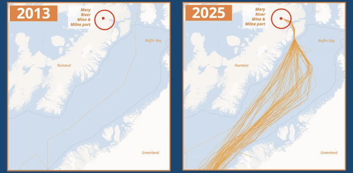 One example is Canada’s Mary River Mine, which began production in 2015 at one of the world’s richest iron ore deposits. Since then, bulk carrier traffic into Baffin Bay has surged manyfold, with ships logging over 130,000 nautical miles in 2025 alone hauling ore and supplies.