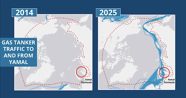 LNG shipping has also expanded dramatically. Before late 2017, no LNG traffic was recorded in Russia’s Arctic waters. In 2025, 40 distinct LNG carriers operated in the Polar Code area, many supporting projects like Yamal LNG, whose specialized icebreaking tankers now deliver gas year-round to Europe and Asia.