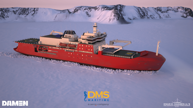 The new icebreaker is designed by Danish naval architects, Knud E. Hansen, and will be built by Damen Shipyards of the Netherlands. DMS Maritime, owned by British-based Serco, has been selected as the preferred tenderer in the project.