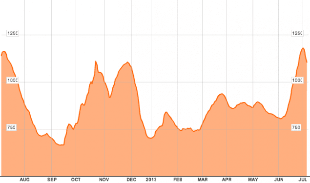 Baltic Dry Index, past 12 months as of 5 July 2013, via Bloomberg