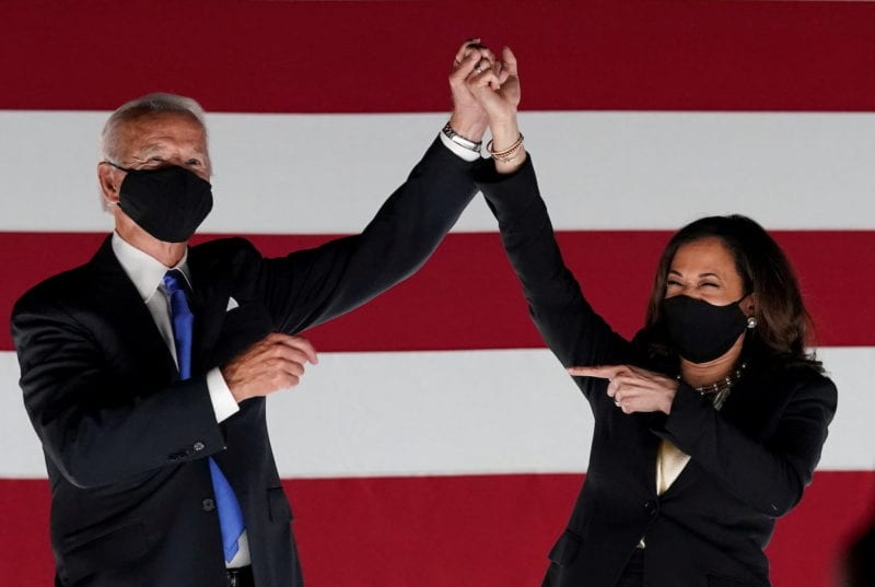 FILE PHOTO: Democratic presidential candidate and former Vice President Joe Biden and U.S. Senator and Democratic candidate for Vice President Kamala Harris celebrate outside the Chase Center after Biden accepted the 2020 Democratic presidential nomination during the largely virtual 2020 Democratic National Convention, in Wilmington, Delaware, U.S., August 20, 2020. REUTERS/Kevin Lamarque/File Photo