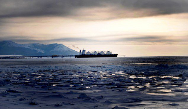 The ice has just melted and the Grand Aniva, purpose-built in Japan to carry Liquefied Natural Gas, waits to leave Aniva Bay terminal after being loaded with LNG. Image: Shell
