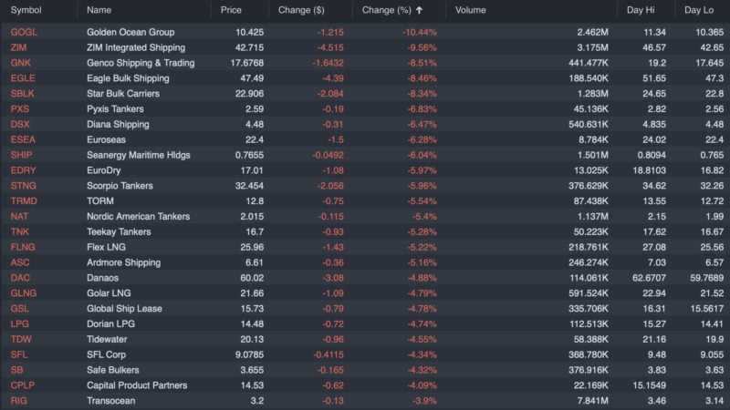 Today many of Wall Street analysts’ favorite shipping stocks dropped with container and bulk stocks falling the most. Recent favorites like Zim Integrated Shipping $ZIM (down 9.5% at time of writing), Genco Shipping $GNK (down 8.5%), and Eagle Bulk Shipping $EGLE (down 8.46%).
