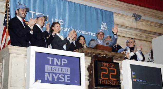 Nikolas Tsakos (middle with hand up) rings the closing bell of the New York Stock Exchange in celebration of the Tsakos Energy Navigation’s 20th anniversary as a public company, March 22, 2013. Image: TEN, Ltd.