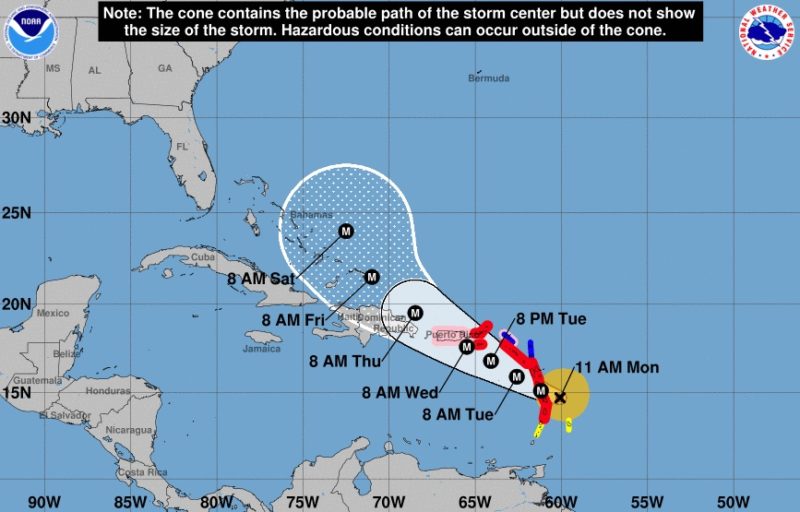 Hurricane conditions also are possible by Tuesday for Antigua, Barbuda, St. Kitts, Nevis, Montserrat, Saba, St. Eustatius, Sint Maarten, St. Martin, St. Barthelemy and Anguilla, the NHC said.