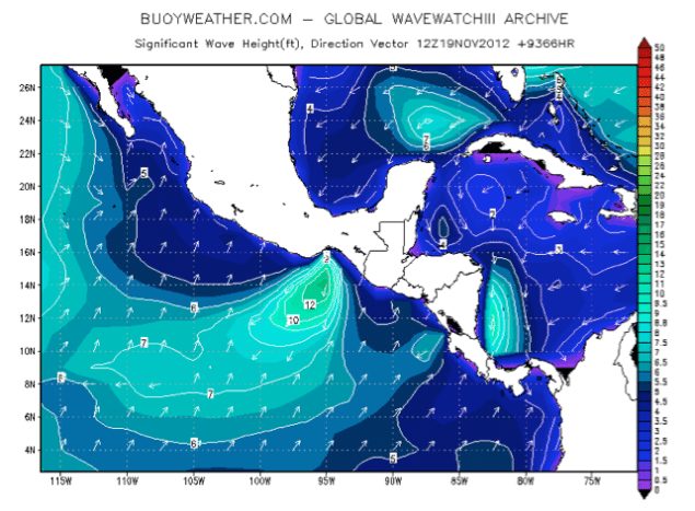 Buoyweather.com historical wave height chart for November 19, 2012 showing an area of 10-15ft seas in the Gulf of Tehuantepec.