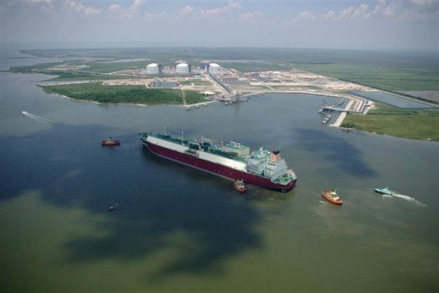 A Qatar Gas LNG carrier approaches Sabine Pass in 2008, a time when the US was an importer of LNG