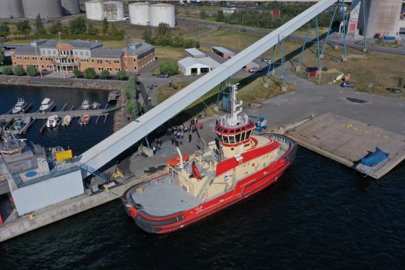 Press Release – On Tuesday the 20th of August in the Port of Luleå, Sweden, the most powerful ice-breaking tug of this size, TundRA 3600-H (Hybrid) tug VILJA was christened. About 100 people witnessed as the Board Chair Ms. Birgitta Ahlqvist broke the bottle-shaped ice sculpture specifically made for this event. Some of the speeches had to be cut short due to rapidly melting ice as the crowd was treated with a warm summer day.