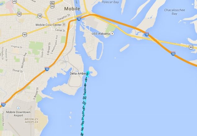 The latest AIS data from MarineTraffic.com shows the Delta Amber underway using engine just south of Mobile, Alabama at 03:31:57 UTC (10:31 p.m CDT) on 13 October.