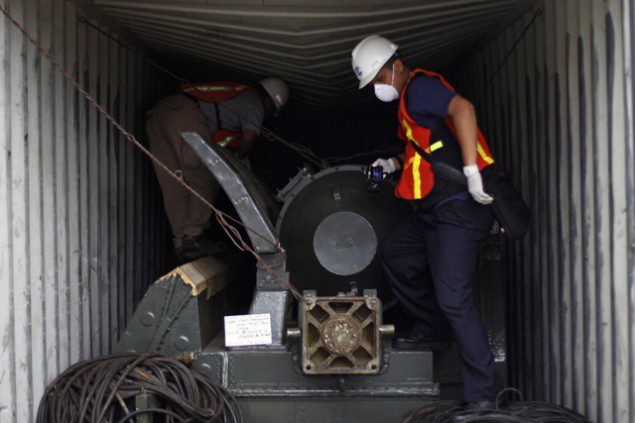 Panama forensic workers work in a container holding a green missile-shaped object seized from the North Korean flagged ship “Chong Chon Gang” at the Manzanillo Container Terminal in Colon City July 17, 2013. (c) REUTERS/Carlos Jasso