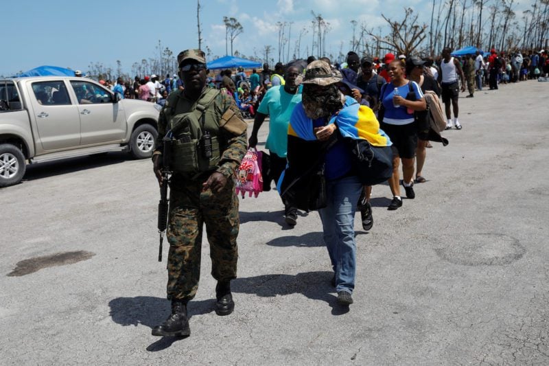 A soldier leads people onto a plane during an evacuation operation after Hurricane Dorian hit the Abaco Islands in Treasure Cay, Bahamas, September 7, 2019. REUTERS/Marco Bello