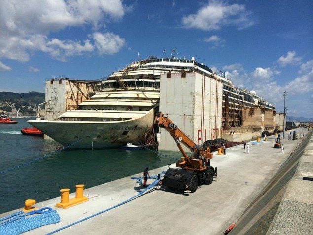 After hours of preparation, dockworkers fixed the wreck in place in the industrial port of Voltri, just outside the main harbour in Genoa.