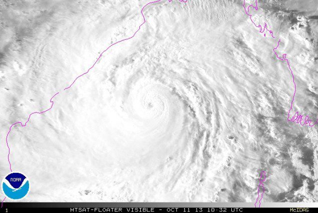 Visible imagery of Cyclone Phailin shows the storm over Bay of Bengal as it approaches India’s east coast. Image (c) NOAA