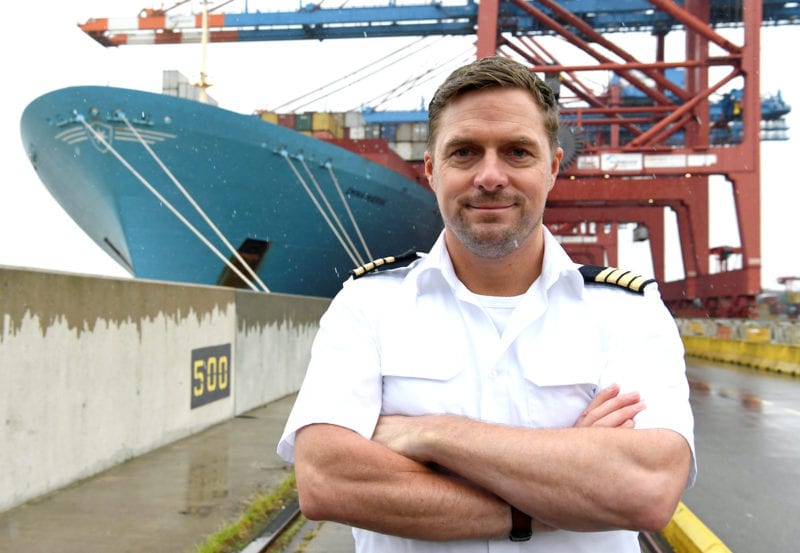 Captain Jens Boysen gives an interview in front of the Maersk Line container ship “Emma Maersk” during the spread of the coronavirus disease (COVID-19) in the harbour in Hamburg, Germany July 9, 2020. REUTERS/Fabian Bimmer