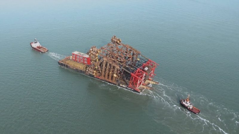 The steel jacket for the Hejre platform in Danish North Sea heads for installation in May 2014.