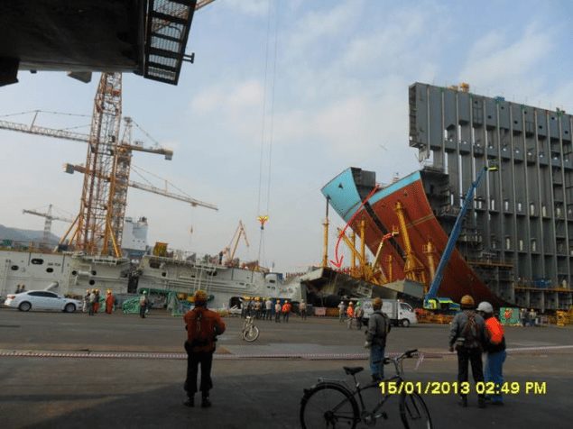 OKPO, KOREA – On 15 January at 1435 local time, a shipyard worker was killed and 3 others slightly injured by a massive piece of steel that fell off of an adjacent ship under construction at Daewoo Shipbuilding and Marine Engineering (DSME) in Okpo, Korea. The steel apparatus crushed an adjacent structure where the deceased was located at the time of the incident.