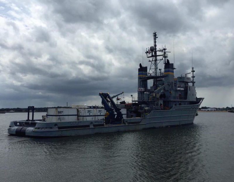 The USNS Apache (T-ATF 172) departs Virginia Beach, Virginia, Friday, August 5, 2016, to support the National Transportation Safety Board’s mission to retrieve the voyage data recorder from the site of the sunken cargo ship El Faro. Photo: Military Sealift Command