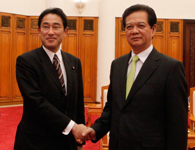 Japan’s Foreign Minister Fumio Kishida (L) poses for a photo with Vietnam’s Prime Minister Nguyen Tan Dung at the Government Office in Hanoi August 1, 2014. Kishida is in Hanoi on a three-day visit to Vietnam from July 31 to August 2. REUTERS/Kham