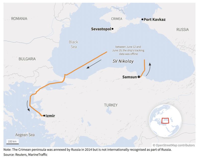 There are gaps in ship-tracking data as well. Ships typically openly broadcast their position, which is captured in publicly available databases. But the SV Nikolay’s tracking system was offline for an eight-day stretch during its June journey. Ships also report non-public positional data to the country or flag state they are registered with, but Reuters was unable to obtain that data for the SV Nikolay.