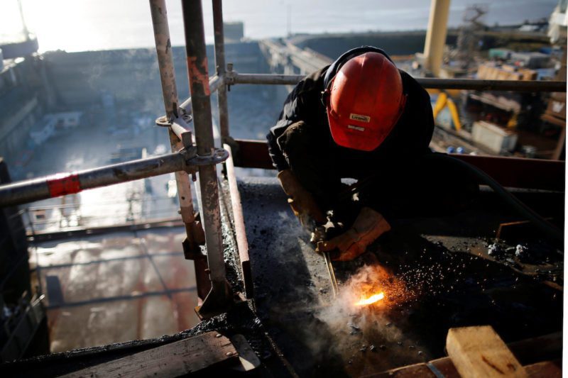FILE PHOTO: A ship builder works on a section of the Oasis Class 3 cruise ship under construction at the STX Les Chantiers de l’Atlantique shipyard site in Saint-Nazaire, France, February 17, 2015. REUTERS/Stephane Mahe/File Photo