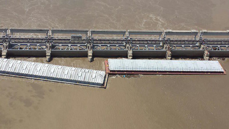 On June 14, 2014, two barges broke free from a tug and drifted into the protection cells of the Starved Rock Lock and Damn on the Illinois River in Utica. Photo: U.S. Coast Guard