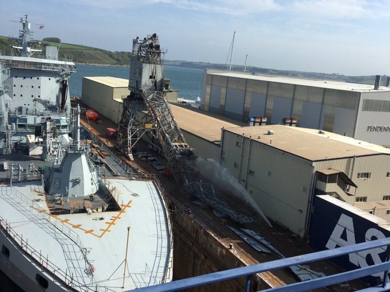 According to reports, the crane was working on the Royal Fleet Auxiliary tanker Tidespring when the crane operator suspected something was wrong and maneuvered the boom away from the ship. The tanker was not damaged in the incident.