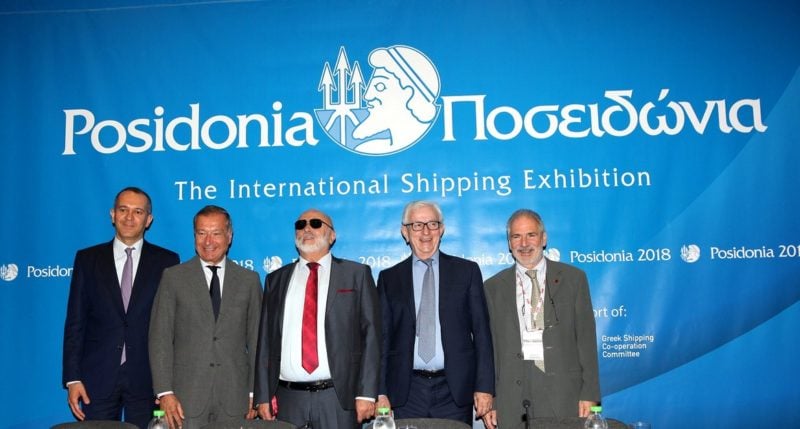 Theodoros Veniamis, President of the Union of Greek Shipowners, pictured second during a press conference at the 2018 Posidonia International Shipping Exhibition. Photo: Posidonia