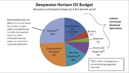 In more news from the Gulf, a report released by an interagency team of scientists assembled by the National Incident Command has details on what has happened to the oil that has leaked from the blown out Macondo well. The figures, based on an estimated 4.9 million barrels leaked, states that only 26% of the oil remains in the Gulf. As for the remaining 74% – 25% has evaporated or dissolved, 16% has naturally dispersed and 33% has been either been recovered, burned, skimmed or chemically dispersed through Unified Command Response Opertions.