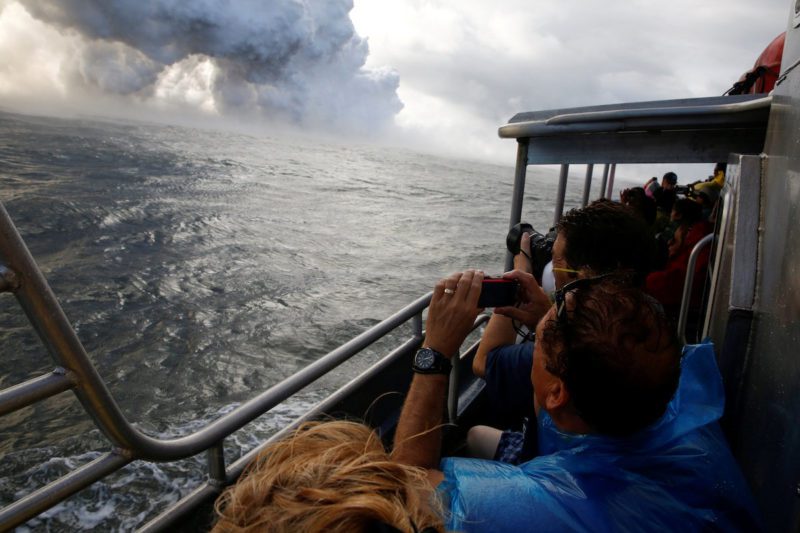 FILE PHOTO: People watch from a tour boat as lava flows into the Pacific Ocean in the Kapoho area, east of Pahoa, during ongoing eruptions of the Kilauea Volcano in Hawaii, U.S., June 4, 2018. REUTERS/Terray Sylvester/File Photo