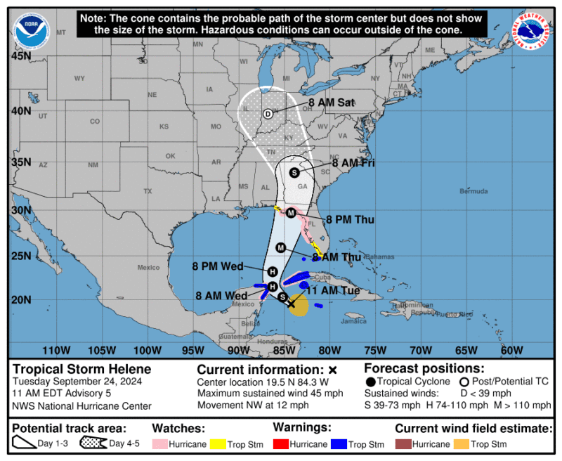 According to satellite data, environmental conditions are becoming increasingly favorable for the storm’s development. The NHC anticipates that Helene will strengthen rapidly due to decreasing wind shear, high oceanic heat content, and upper-level divergence. The NHC forecast predicts Helene will reach a peak intensity of around 100 knots (115 mph) within 48 hours while over the eastern Gulf of Mexico, potentially making it a major Category 3 hurricane. Despite the possibility of increased wind shear as the system approaches the coast, its large size may result in only slow weakening, maintaining the risk of Helene making landfall as a major hurricane.