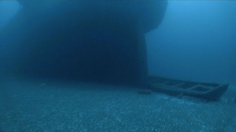 Ironton rests hundreds of feet below the surface with its three masts standing and rigging attached to the spars, and is magnificently preserved by the cold freshwater of Lake Huron. An anchor rests still attached on the bow of the sunken schooner barge. Photo: NOAA/ Undersea Vehicles Program UNCW