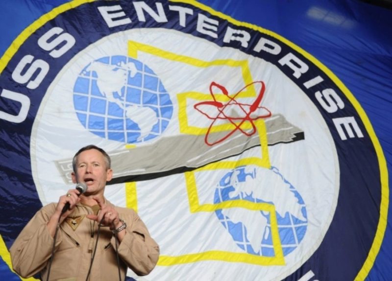 Rear Adm. Ted “Twig” Branch, Bruce Loveless’ former CO, speaks to the crew aboard the aircraft carrier USS Enterprise. 2012 U.S. Navy photo by Mass Communication Spec. 3rd Class Heath Zeigler