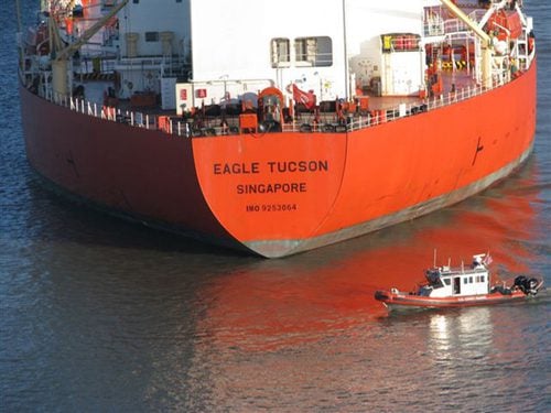This incident photo released by the U.S.C.G. shows the M/V Eagle Tuscon grounded near Pilottown, La., at the mouth of the Mississippi. The Eagle Tuscon grounded at approximately 2:45 a.m., Monday, Sept. 28, 2009, causing a blockage shipping traffic for vessels with a draft of over 35 feet. The vessel was loaded with approximately 602,000 gallons of crude oil at the time of grounding however there have been no signs of oil leaking or water ingress.