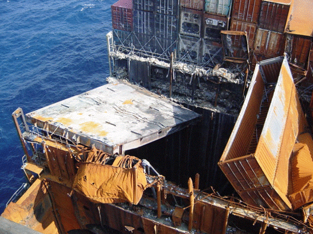 After a brief hiatus we return to a popular gCaptain feature “Incident Photo Of The Week”. This weeks photo is the aftermath of a 2002 fire aboard the M/V Hanjin Pennsylvania. The reason for the damage? A container filled with fireworks! CargoLAw.com tells us;