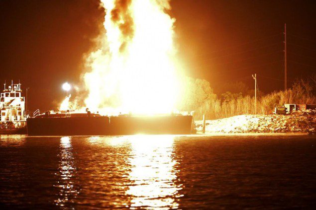 The City of Mobile Fire Department, local harbor tugs fitted with fire monitors, and the Coast Guard responded to the scene. The fire department contained the fire to the tank barges and later extinguished the fire by early the next morning.