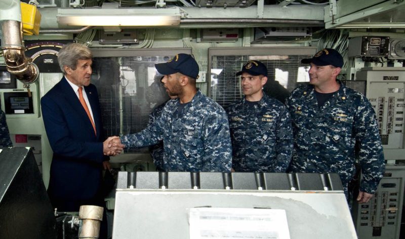 U.S. Secretary of State John Kerry shakes hands with Sailors on the bridge of the Avenger-class Mine Countermeasures ship USS Devastator (MCM 6) during a visit to Naval Support Activity Bahrain. (U.S. Navy photo by Ryan McLearnon)