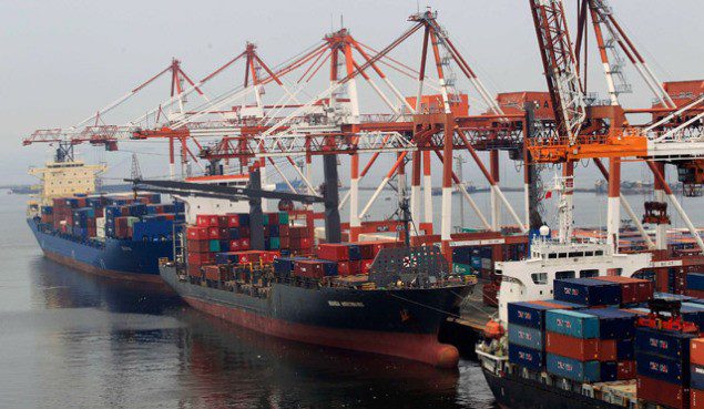 Cargo vessels docked at Manila’s main port wait to unload containers on August 20, 2014. (c) REUTERS/Romeo Ranoco