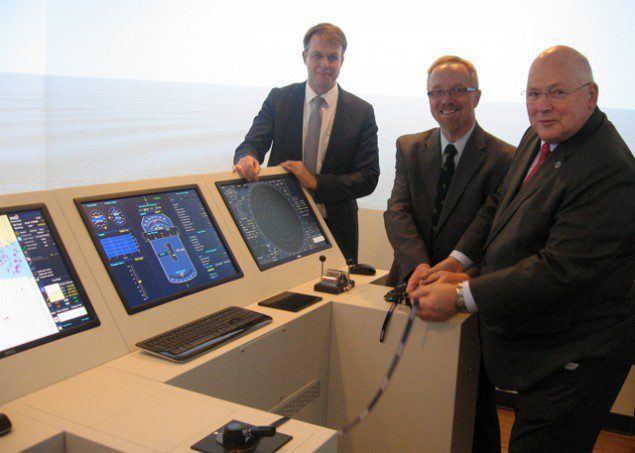 On Tuesday December 10th SNAME President Peter Noble and Robert Hanraads from the Nautical Institute jointly opened the new bridge simulator at the MARIN offices in Houston. They were asked by MARIN for this event to illustrate that this simulator was built as a bridge between engineering and operations. Watched by representatives of oil majors, engineering companies and offshore contractors, Robert Hanraads then performed the first simulated offloading operation on the simulator.