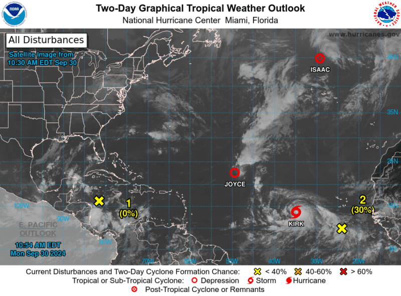 Tropical Storm Isaac remains active several hundred miles north of the Azores, while two tropical depressions, Joyce and Twelve, are being tracked in the central and eastern tropical Atlantic Ocean, respectively.