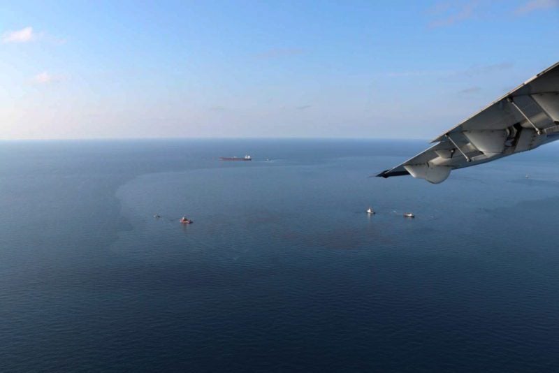 Twelve navy ships and three civilian ships along with a number of aircraft were also working to contain the spill at sea with booms and dispersant spray.