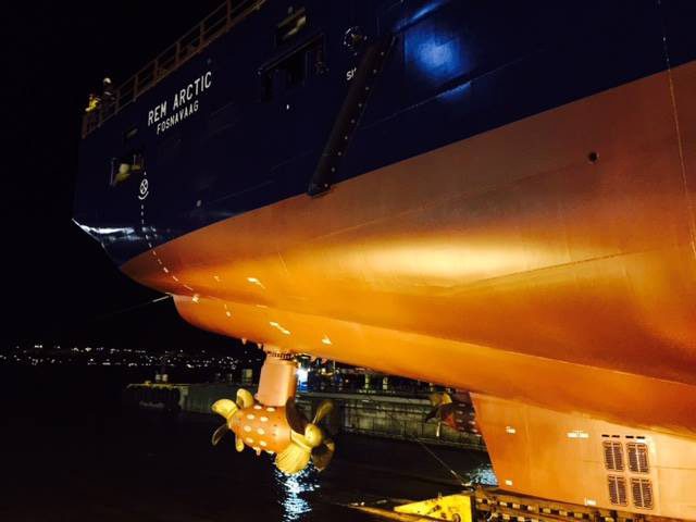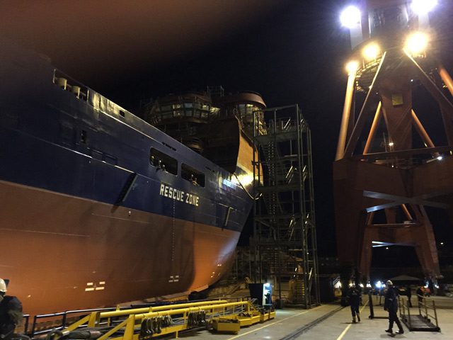 Such was the situation in Ulsteinvik last night at Kleven Verft’ shipyard. The shipyard launched the REM Arctic, a VS 485 MkIII Arctic-design PSV on order for REM Offshore.