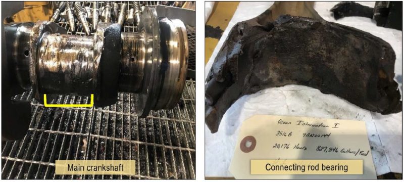 The NTSB determined the probable cause of the diesel generator engine failure was a cylinder’s connecting rod bearing adhering to the crankshaft, which led to the ejection of the connecting rod and catastrophic damage to the engine.