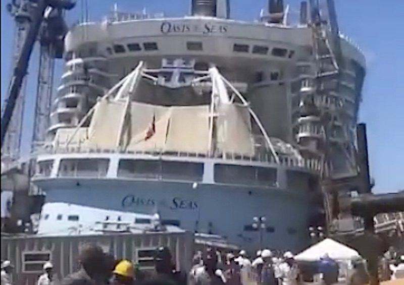According to reports, Royal Caribbean’s 225,000-tonne Oasis of the Seas was in the shipyard’s Dry Dock No. 2 when the accident occurred, leaving at least one large crane toppled on top of the vessel and the cruise ship with a noticeable list to starboard which can been seen in photos and video posted online.