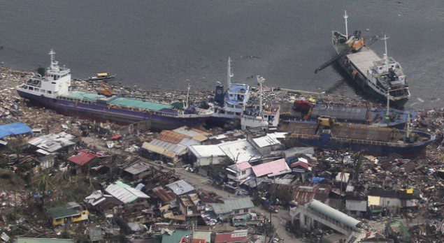An aerial view shows ships washed ashore into a coastal community after Typhoon Haiyan hit the province of Leyte central Philippines November 10, 2013. REUTERS/Ryan Lim/Malacanang Photo Bureau/Handout