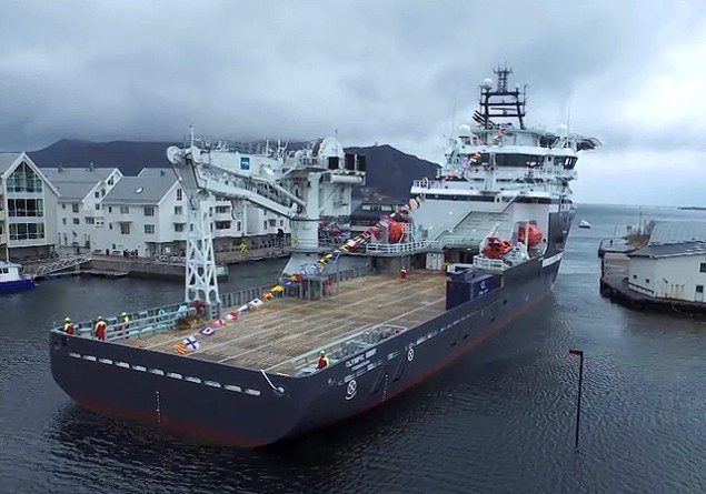 In the following video, the Olympic Bibby is seen entering the narrow Fosnavåg harbour for her naming ceremony on 9 April 2015. The entrance to the harbor is a 22 meters wide giving her only a meter and a half of clearance on either side.