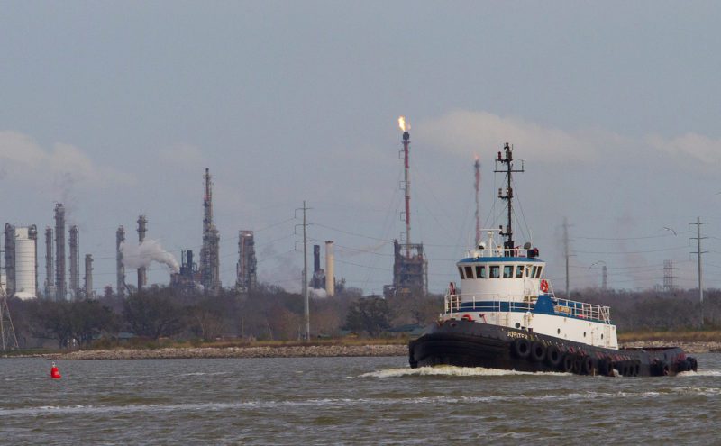 FILE PHOTO: A tug boat navigates the Houston ship channel with a flare from an oil refinery and storage facility in the background south of downtown Houston January 30, 2012. REUTERS/Richard Carson/File Photo