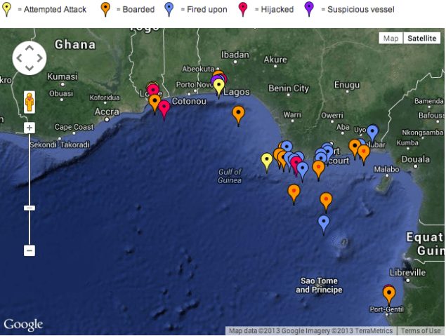 Data from the IMB, which coordinates the fight against maritime crime and malpractice, showed Nigeria remained the main source of piracy in the region with 29 attacks on vessels recorded in the first nine months of 2013, up from 21 in the same period last year.